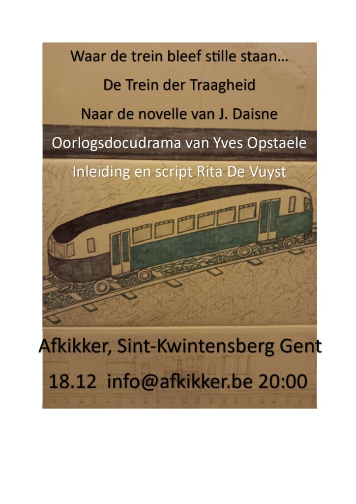 De Trein der Traagheid docudrama 8 mei 21 u, inleiding 20 u, naar de novelle van Johan Daisne. Gratis inkom. Deze novelle gaat over de vlucht van de Vlamingen naar het Zuiden van Frankrijk bij het begin van W.O.II op 10 mei 1940. Daisne als luitenant was belast een trein te vinden om de soldaten in opleiding terug naar België te brengen. Dit heeft 4 maanden geduurd. In Afkikker kan je ook 2 korte onuitgegeven verhalen kopen van Johan Daisne, 7.5 euro. Recruut en Kaki. Recruut gaat over de vooravond van zijn vertrek naar het leger en Kaki gaat over zijn thuiskomst uit Carcassonne. Daisne verbleef aldaar in het kasteel van Pomas. Het boek met alle uitleg: ‘Waar de trein bleef stille staan’ komt op 17.5 euro en is eveneens verkrijgbaar in Afkikker. We hebben ook originele beelden verwerkt uit het archief van Defensie met beelden over Aisne, die verwijzen naar het pseudonym van Daisne. Het filmwerk plus montage is van de hand van Yves Opstaele. Script Rita De Vuyst.